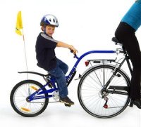 A tag-along bike is a good option for children between approx. 100 cm and 125 cm, as they can pedal themselves and at their own pace but don’t have to worry about other traffic.
