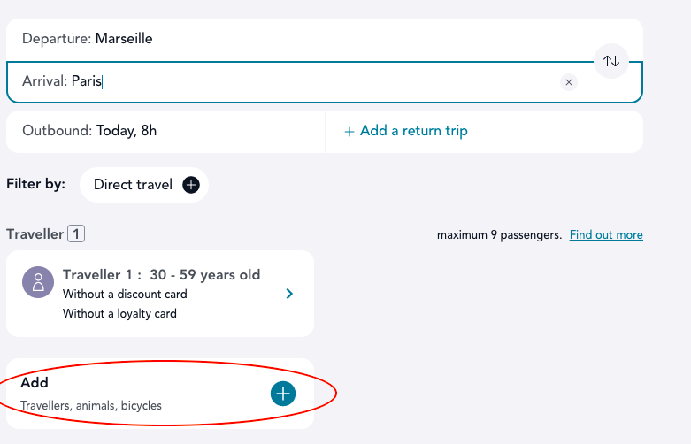 - TER ticket: when you are looking for a train ticket, you must not choose the option "reserve a non-disassembled bike space" otherwise TERs will not be displayed.